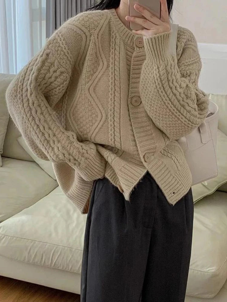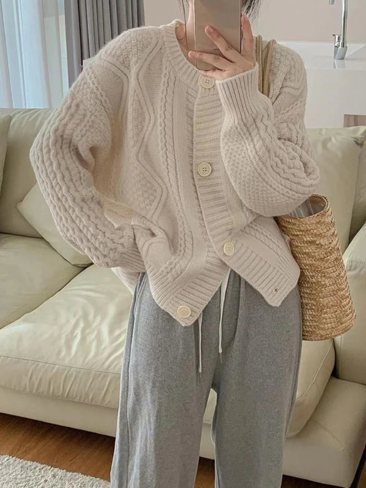 De Cavell™ – Gebreid Vest met Kabelpatroon & Knopen is de perfecte mix van warmte en stijl. Het zachte breisel en de klassieke kabelstructuur zorgen voor een tijdloze uitstraling, terwijl de losse pasvorm heerlijk comfortabel aanvoelt. Ideaal voor een relaxte dag thuis of een casual outfit buitenshuis.