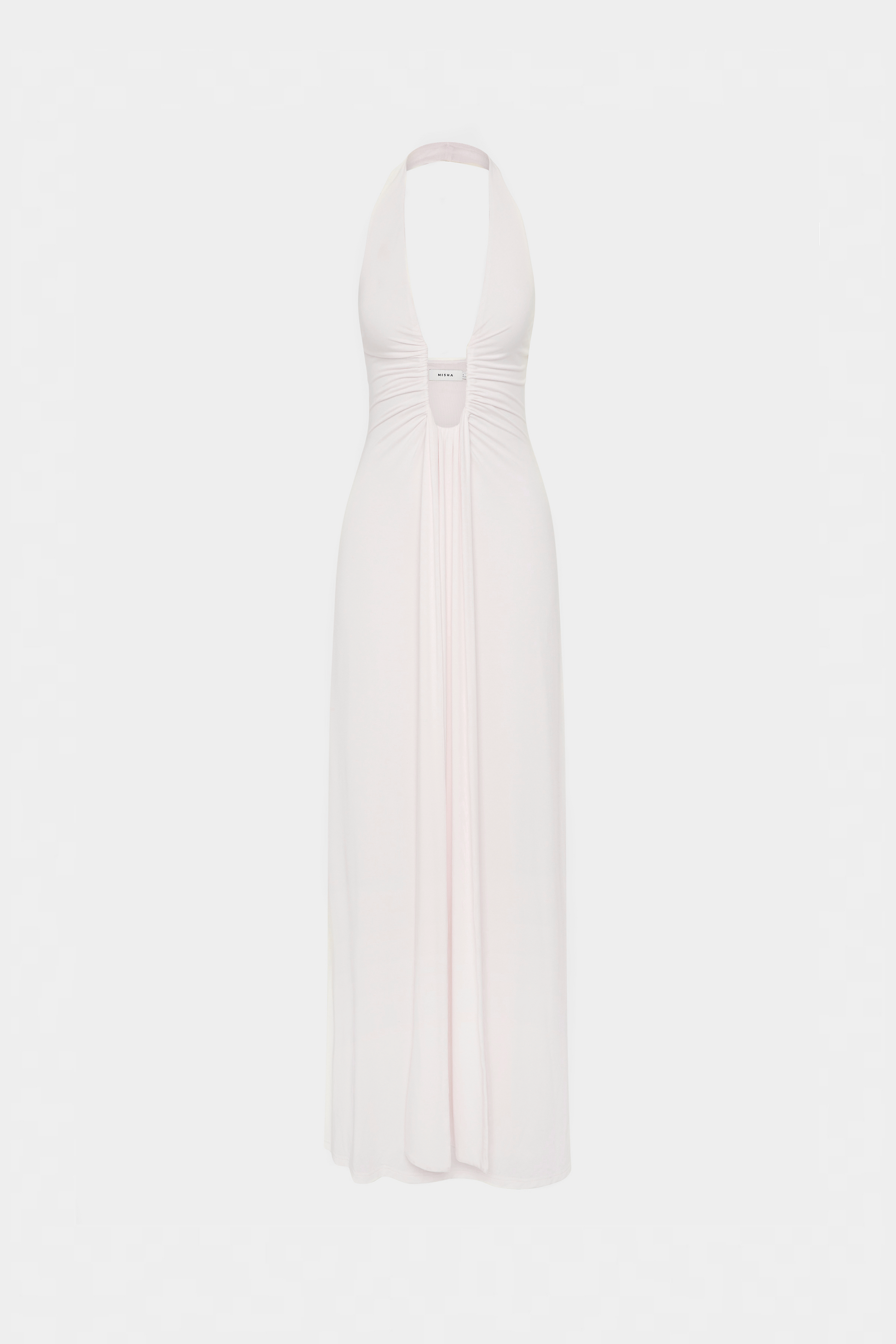 • Halslijn: Diepe halter met elegante plooival