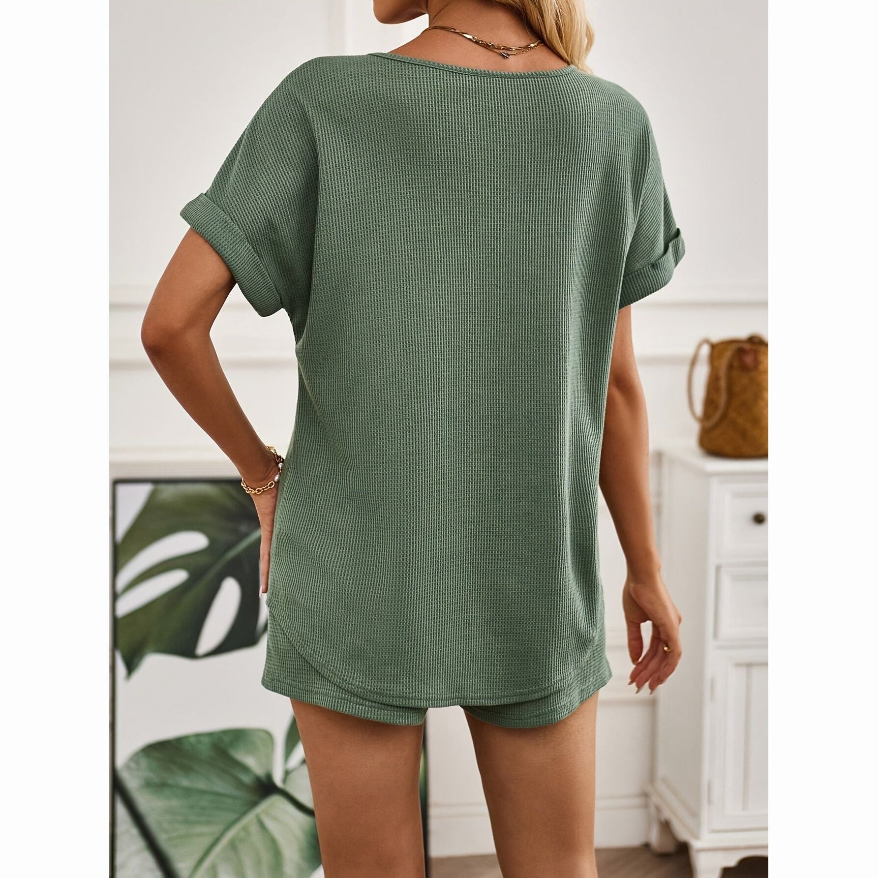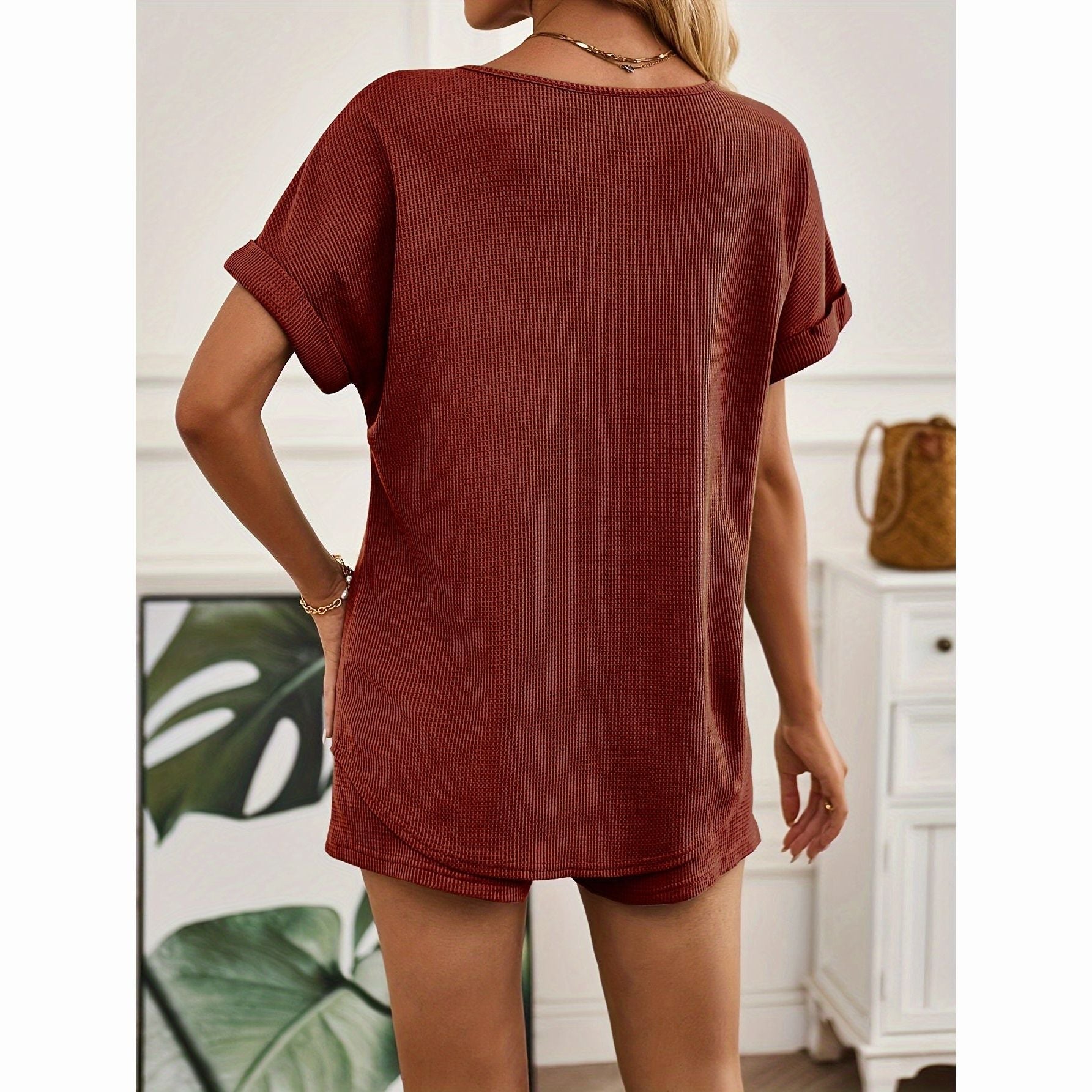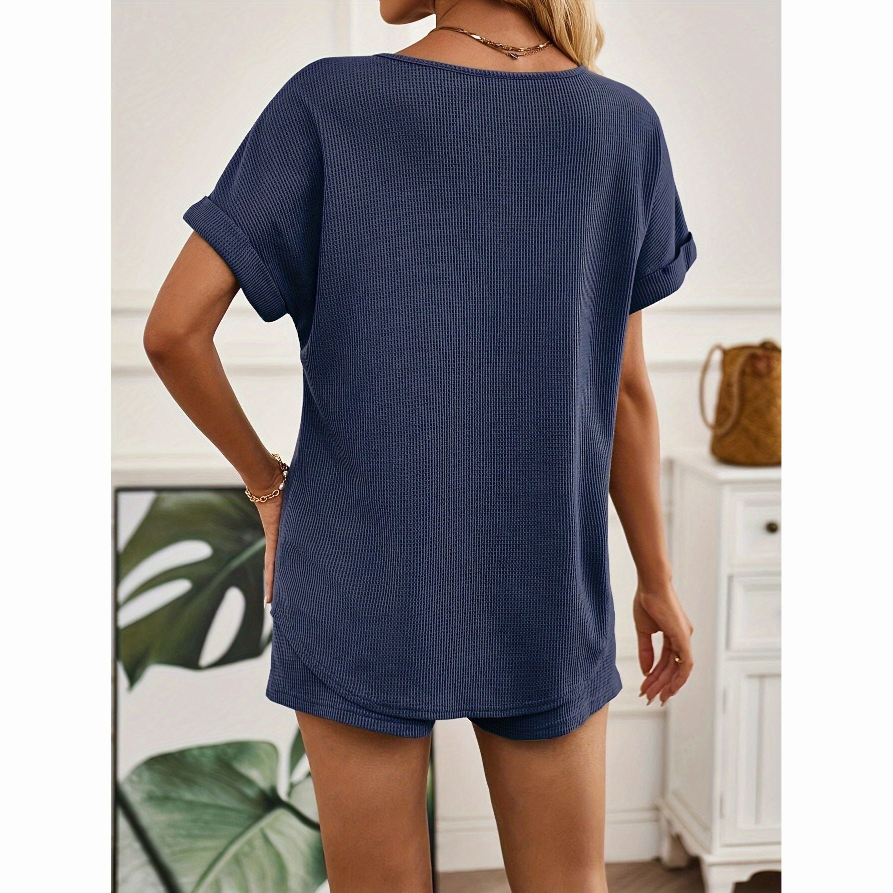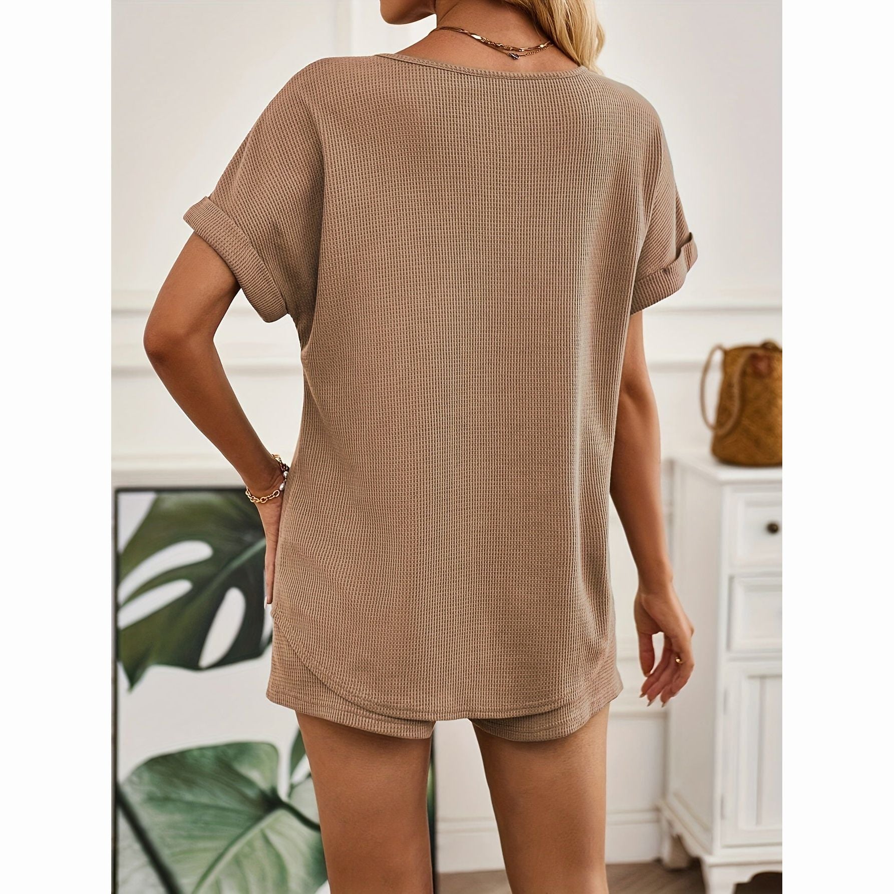 Stel je voor dat je straalt in het zonnetje, omgeven door comfort en stijl. Onze tweedelige set met een V-hals T-shirt en shorts met trekkoord is de perfecte keuze voor elke modieuze vrouw deze lente en zomer.